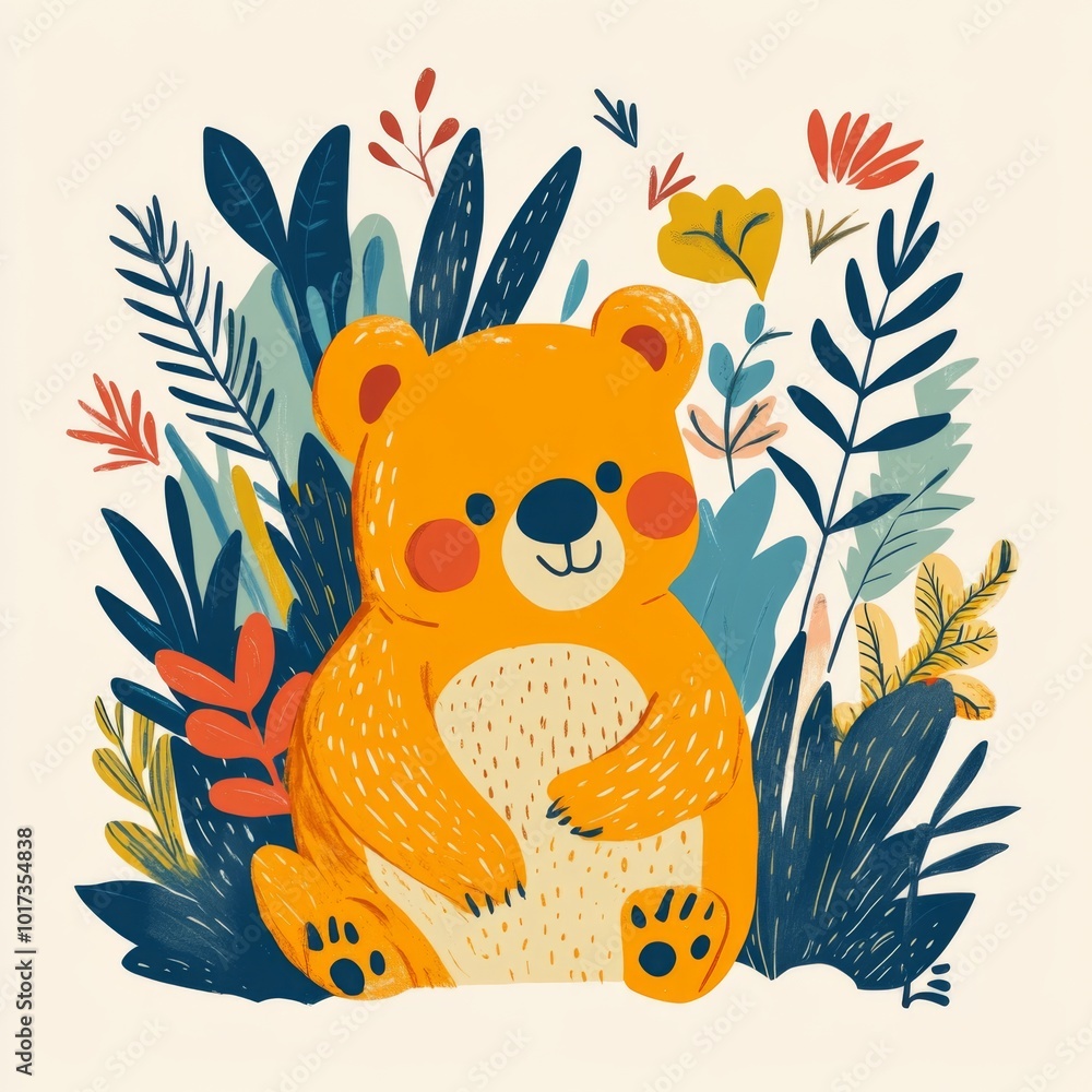 Fotografía A cute, cartoon bear sitting amidst colorful, stylized foliage.