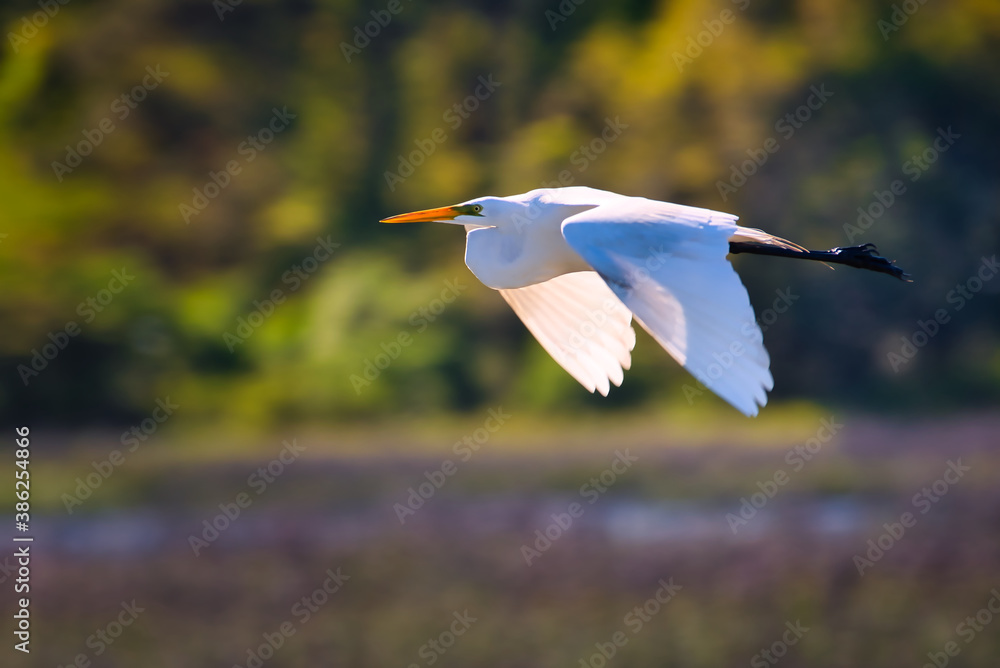 Fotografía A great white egret flying over a salt-marsh near Pawleys Island, South Carolina, USA