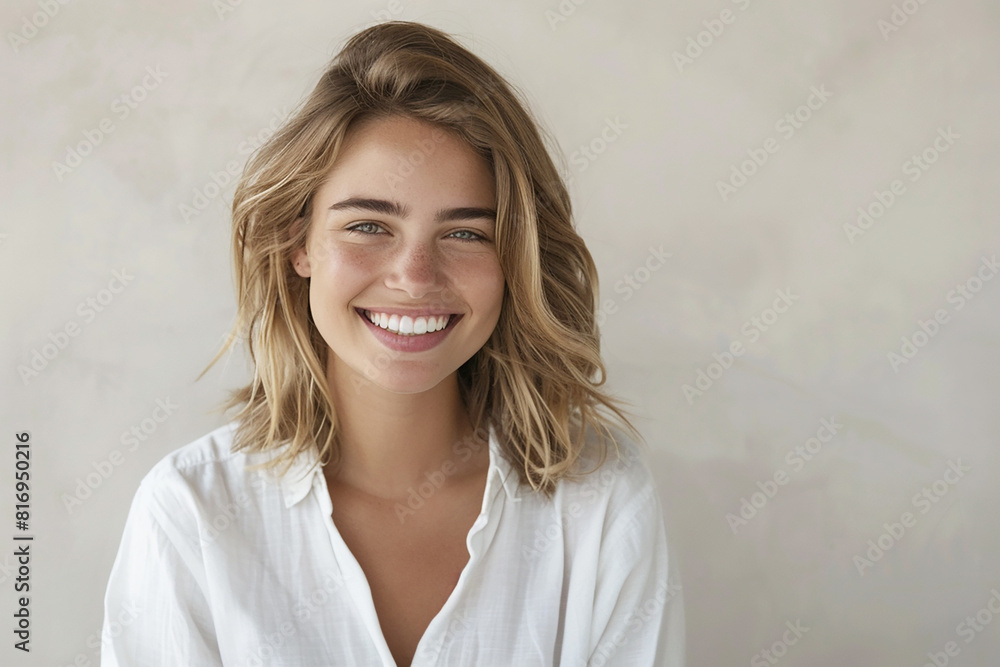 Fotografía A woman with blonde hair and a white shirt is smiling
