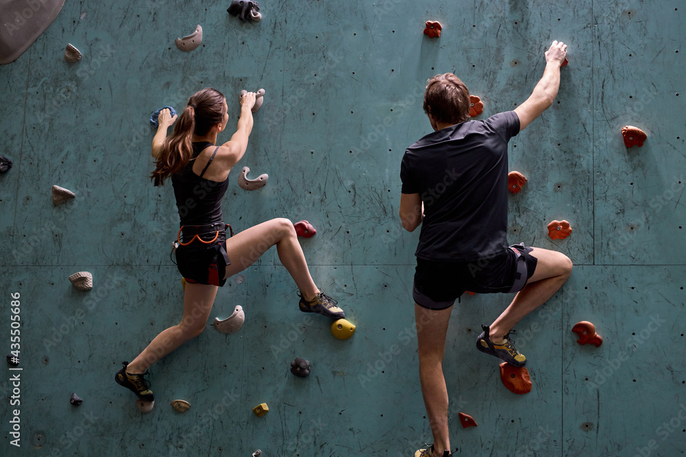 Fotografía Active sporty woman and man in sportive outfit practicing rock climbing on artificial rock in sport club