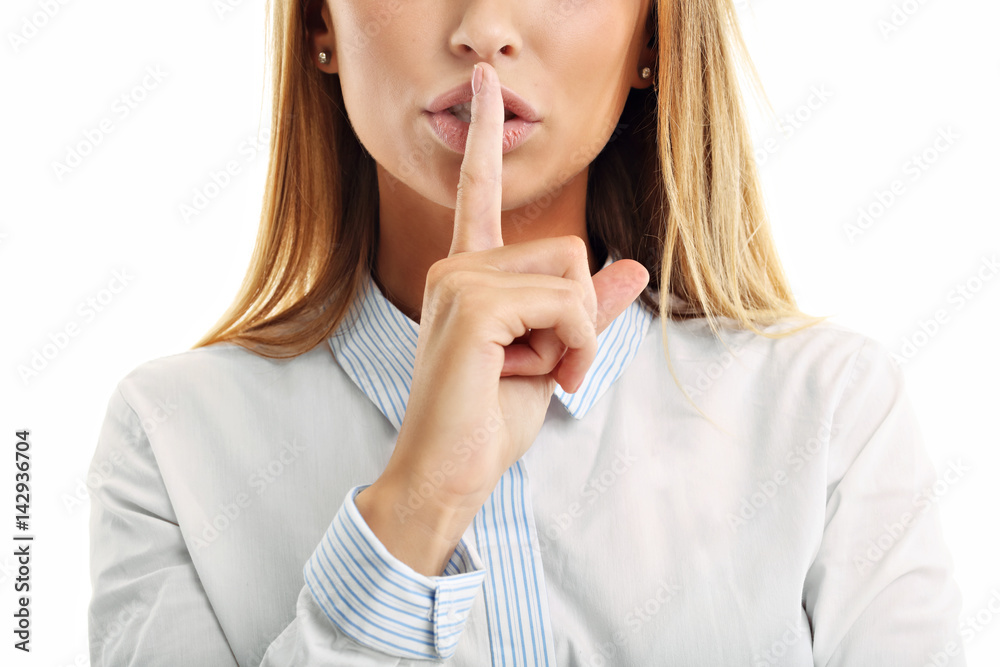 Fotografía Adult woman holding a finger on her lips over white background