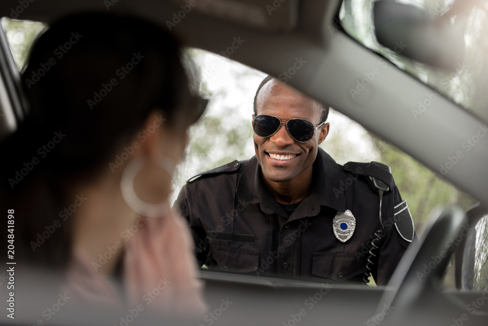 Fotografía african american policeman in sunglasses smiling to young woman sitting in car