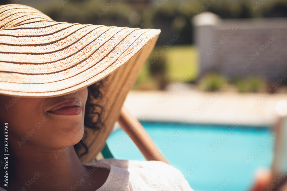 Fotografía African American woman with hat relaxing on sun lounger in her backyard