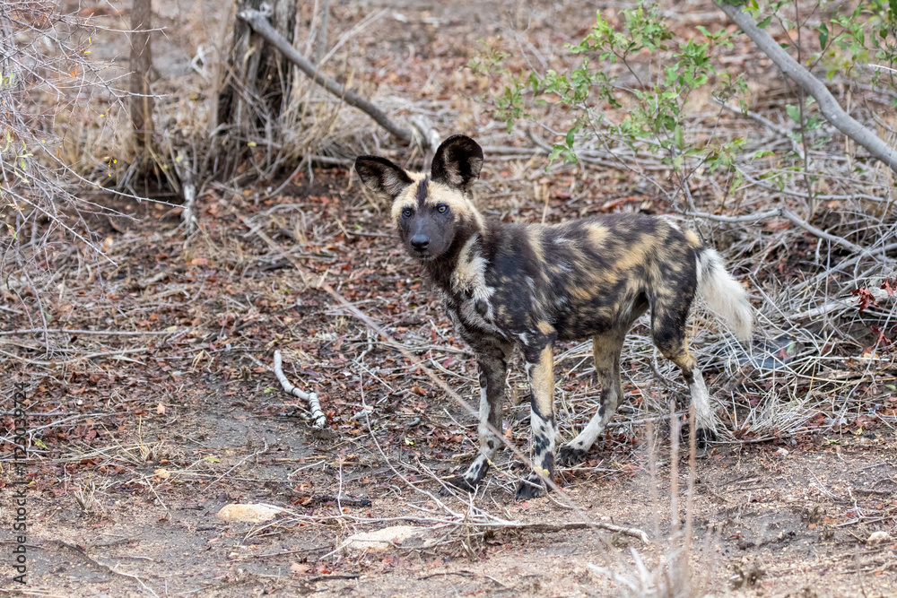 Fotografía African wild dog or African Painted dog, Lycaon pictus, side view,