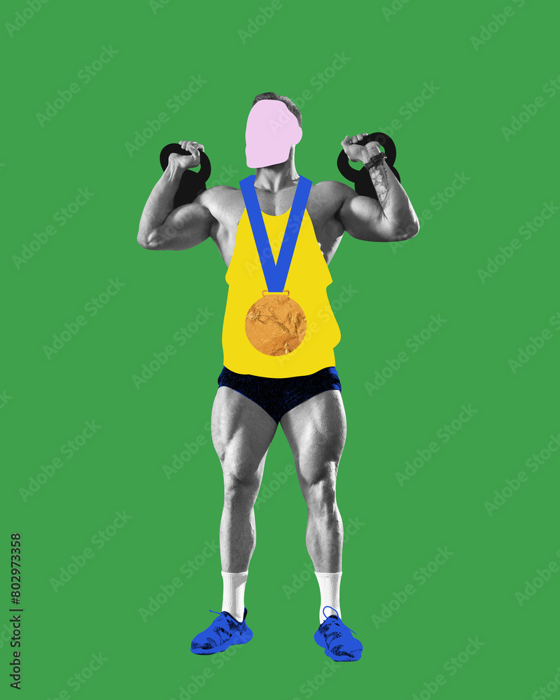 Fotografía Athletic man with muscular body and gold medal, raising dumbbells against green background, Champion, winner