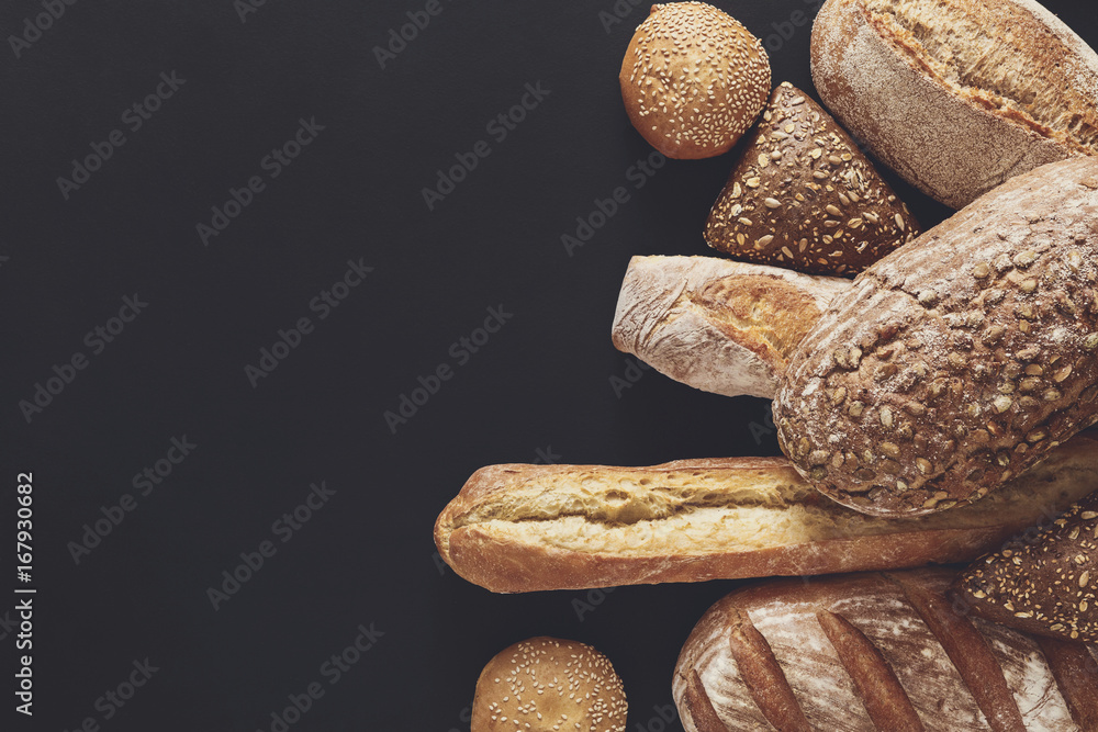 Fotografía Bakery concept. Plenty of bread background isolated on balck