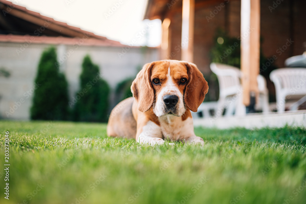 Fotografía Beagle dog laying on the grass outdoors. Pretty dog in the yard.