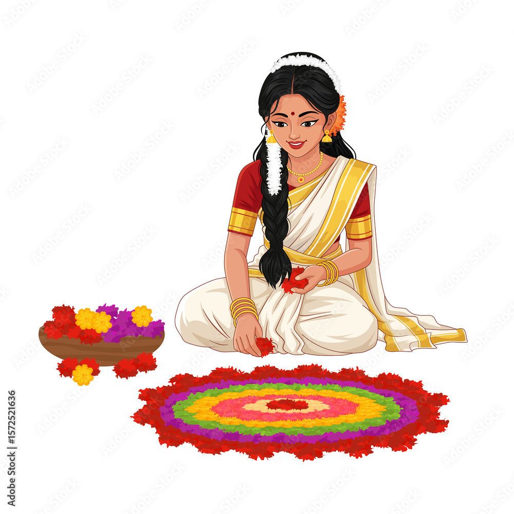 Fotografía Beautiful Kerala Woman Creating Colorful Onam Pookalam for Festival Celebration