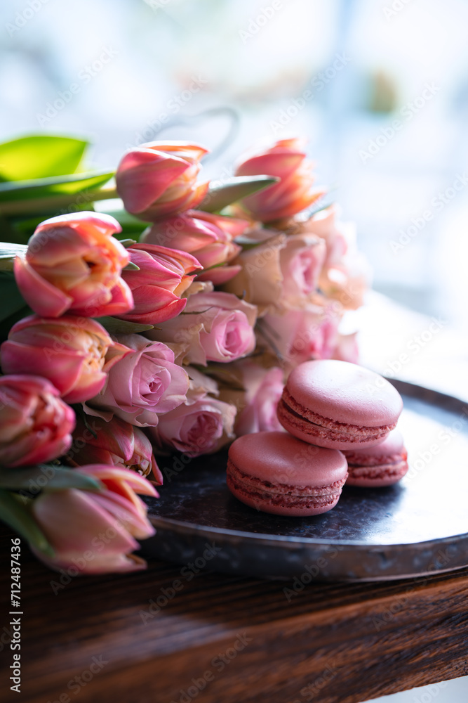 Fotografía Beautiful pink roses and tulips with sweet pastrys