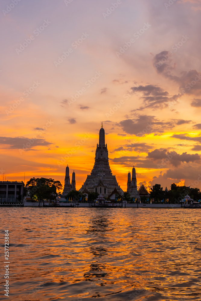 Fotografía beautiful sunset wat arun temple chao phraya river, landscape Bangkok Thailand