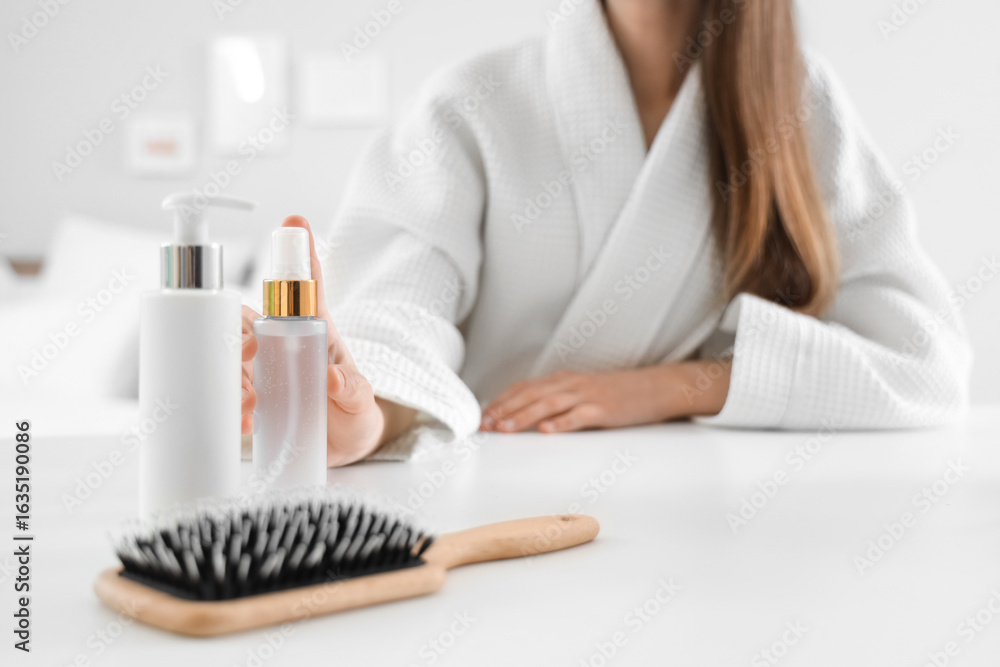 Fotografía Beautiful young woman with cosmetic products and brush on table in bedroom at ho