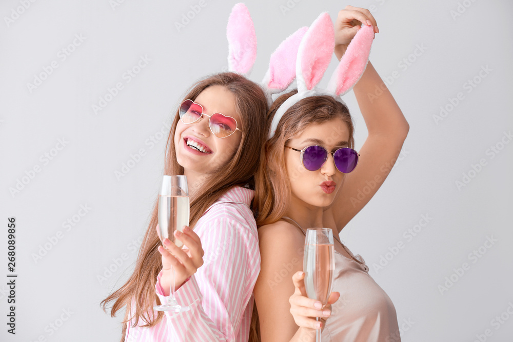 Fotografía Beautiful young women in pajamas and with party decor drinking champagne on ligh