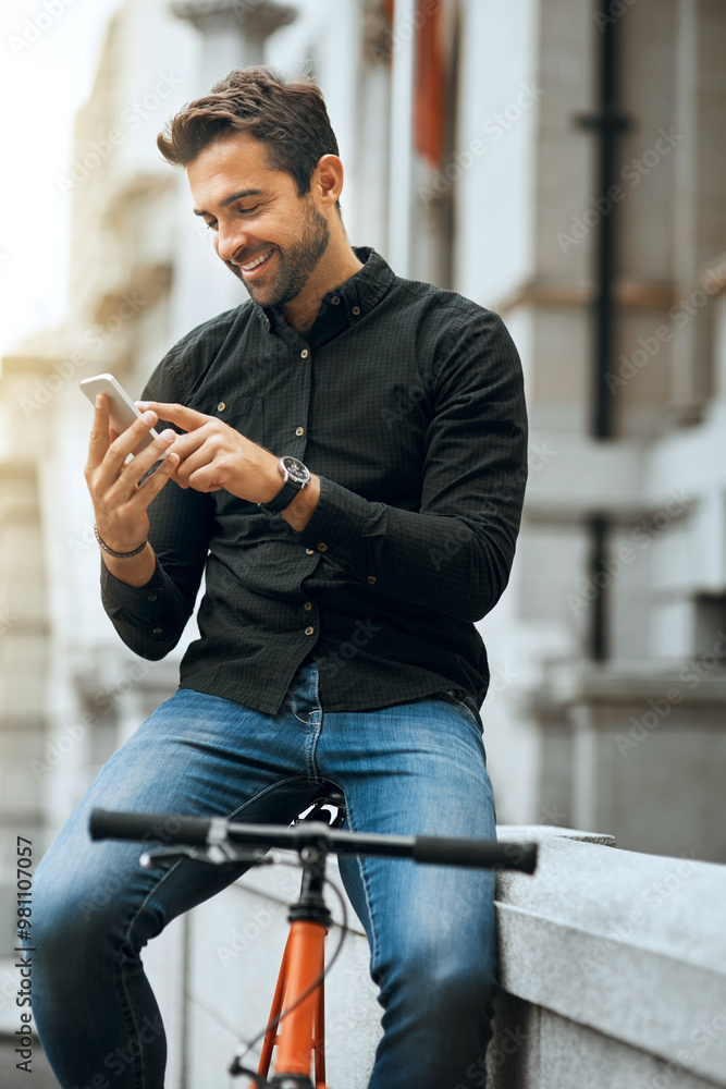 Fotografía Bike, phone and smile with man in city for communication, social media or connection