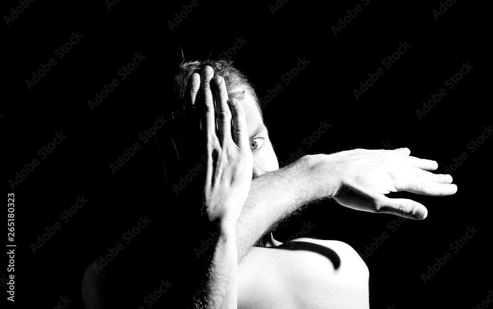 Fotografía black and white photo, a man holds his hands in the face in an expressive pose