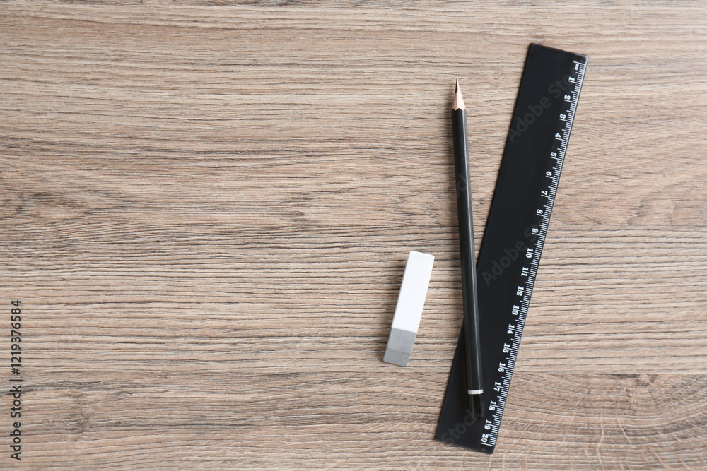 Fotografía Black ruler, pencil and eraser on wooden table, top view
