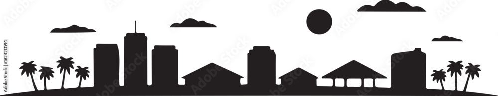 Fotografía Black Silhouette of Majuro Skyline with Flat Island Strip, Buildings, and Palm T