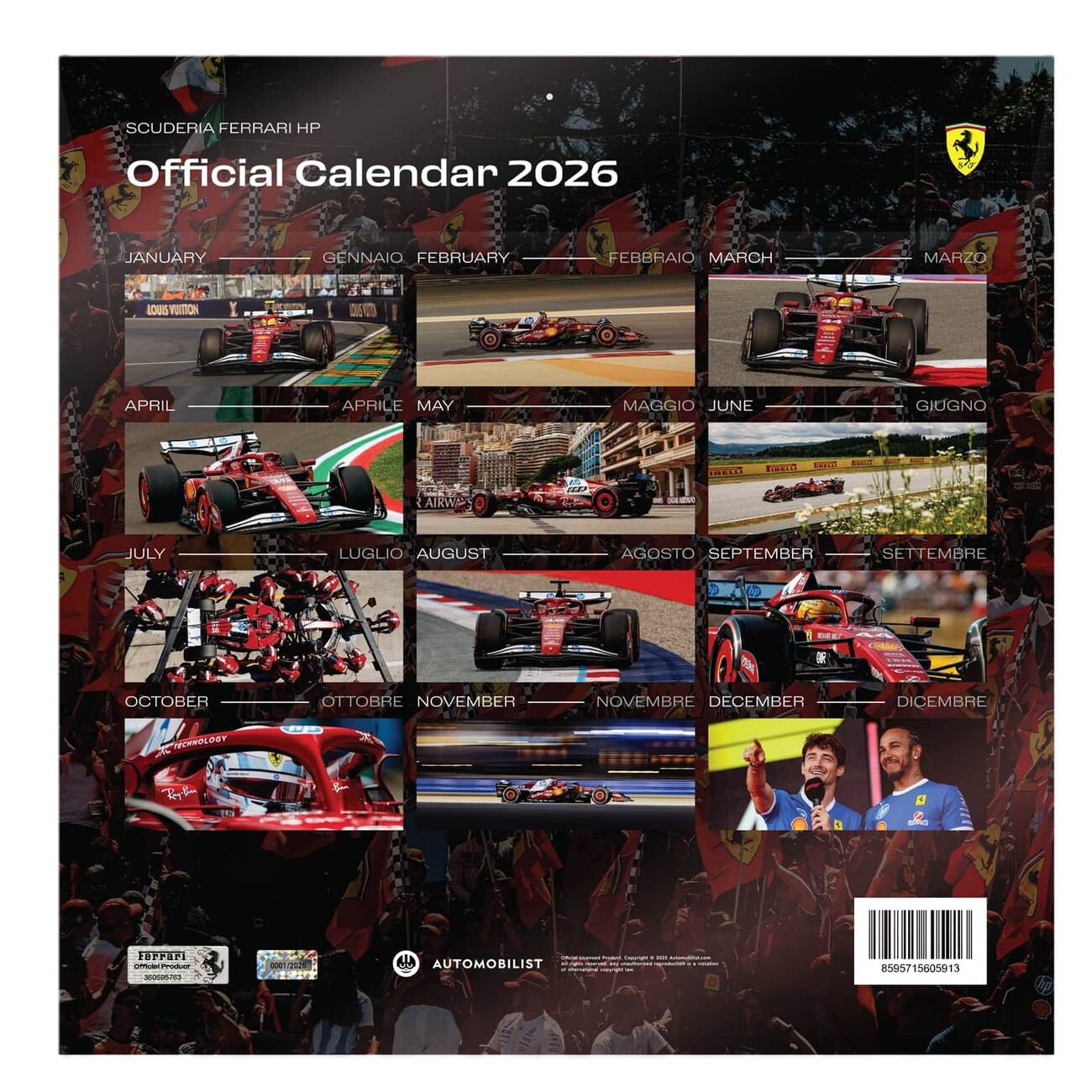 Calendario de pared oficial Scuderia Ferrari HP 2026 con el calendario completo de Formula 1® de marzo a diciembre y 12 imágenes seleccionadas. Edición limitada a 2.026 unidades, impreso en offset de alta calidad sobre papel semibrillo: un regalo perfecto para coleccionistas y fans de F1.
