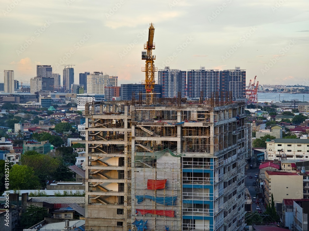 Fotografía Cebu City, Philippines - May 12, 2024: A college building under construction and the Northern Cebu City skyline