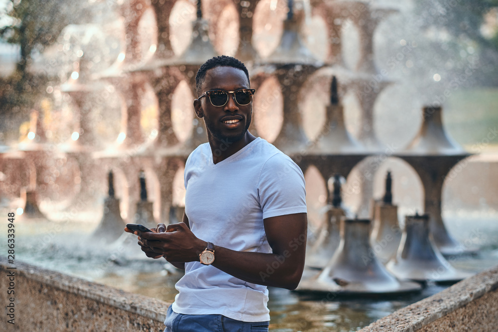 Fotografía Cheerful american businessman is chatting by mobile phone while chilling near fountain