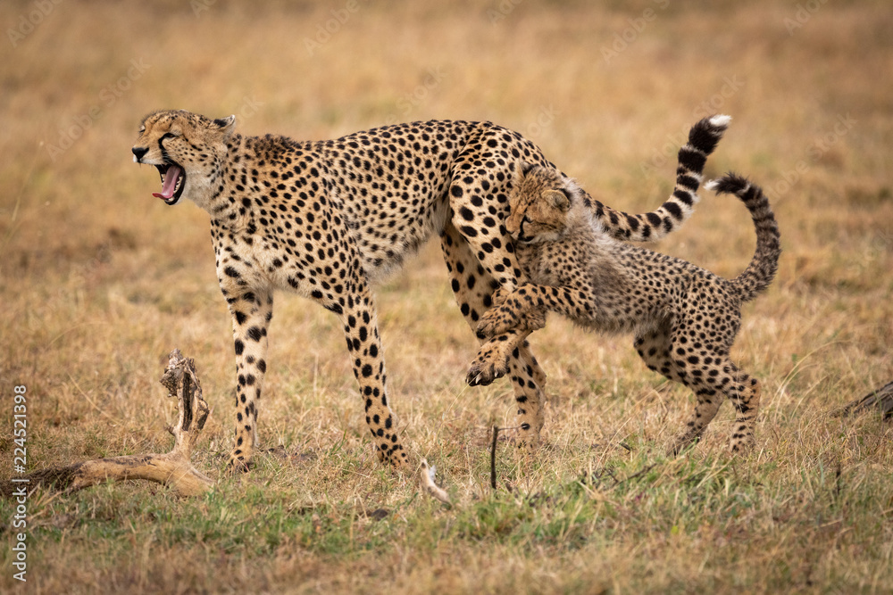 Fotografía Cheetah cub grabs leg of yelping mother