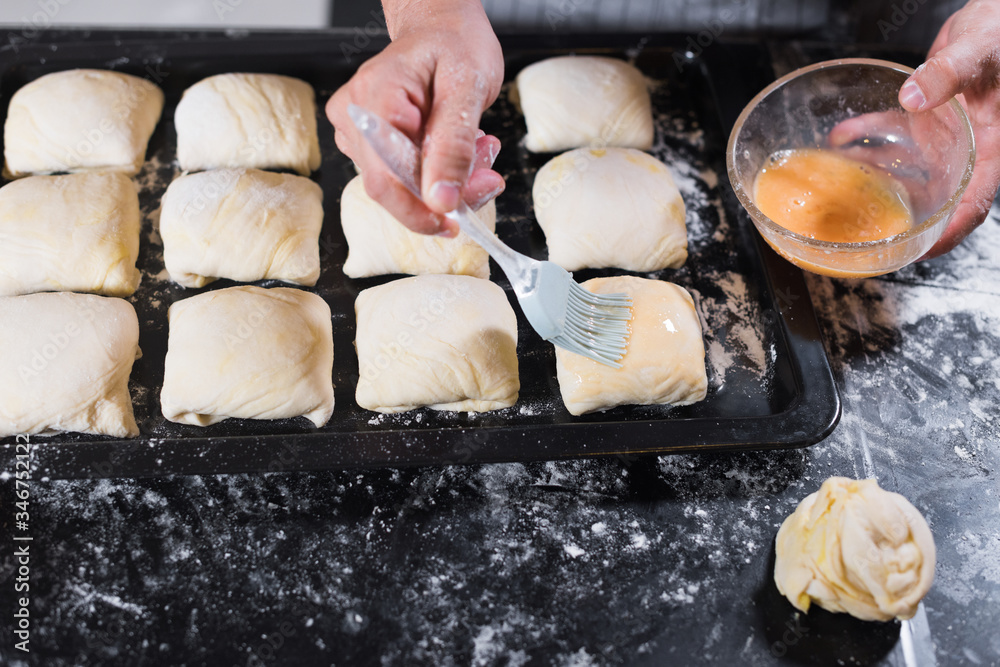 Fotografía Chef hand smearing samsa pasties with egg yolk before putting the pasties in the oven