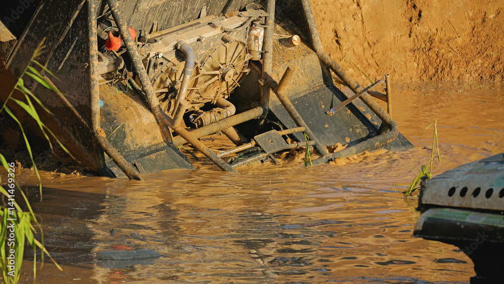 Fotografía Close-up of the rear part of an off-road vehicle prepared for heavy off-roading, stuck in a muddy ditch
