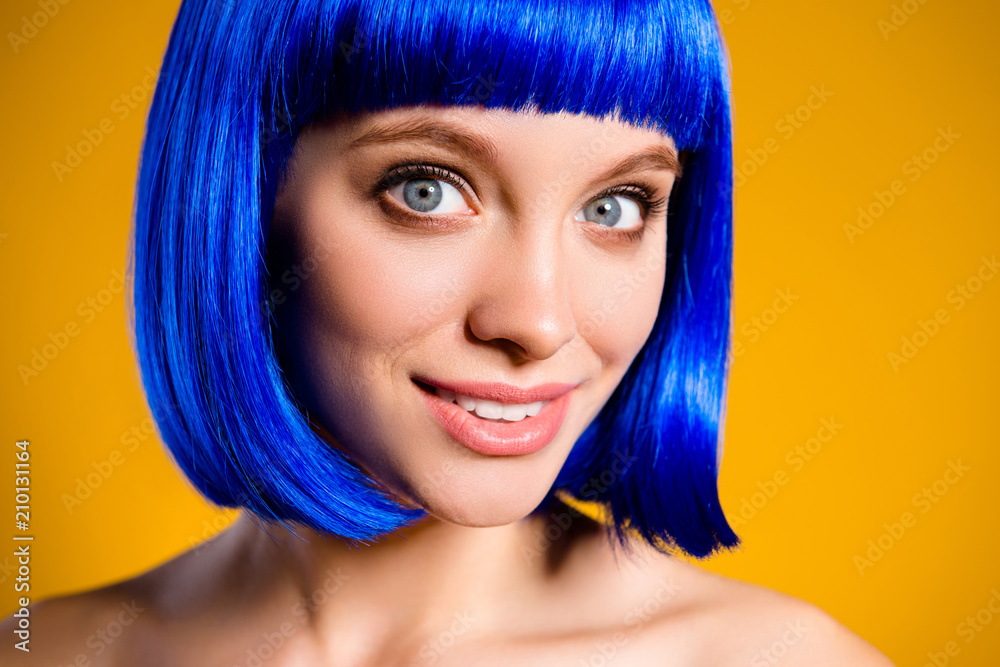 Fotografía Closeup cropped portrait of cheerful positive lady in blue wig having natural ma