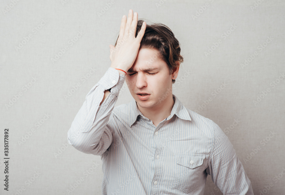 Fotografía Closeup portrait of a upset young man with hand on his head