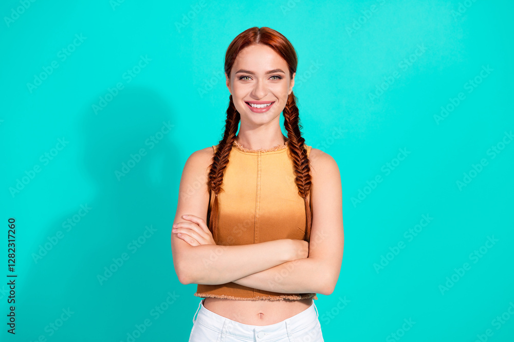 Fotografía Confident young woman with braided hair posing against a vibrant teal background