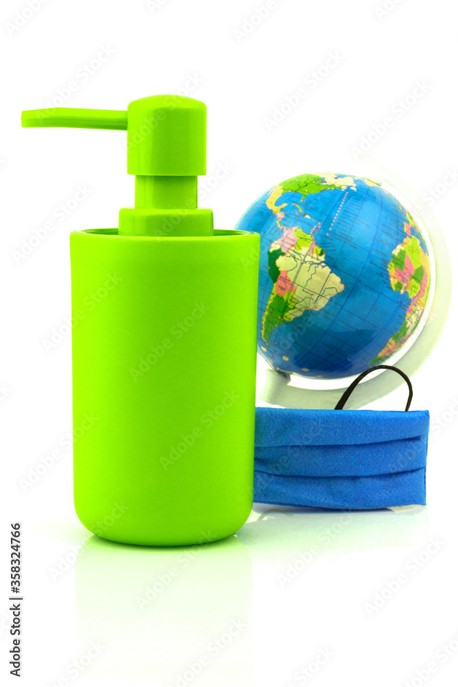 Fotografía Coronavirus concept with blue protective medicine equipment mask, globe and green bottle packing of sanitizer, antiseptic with dispenser for hygienic, fluid, liquid gel