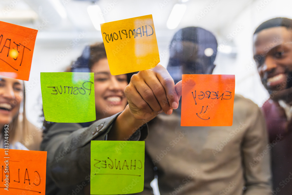 Fotografía Coworkers brainstorming and sharing ideas using sticky notes on glass wall