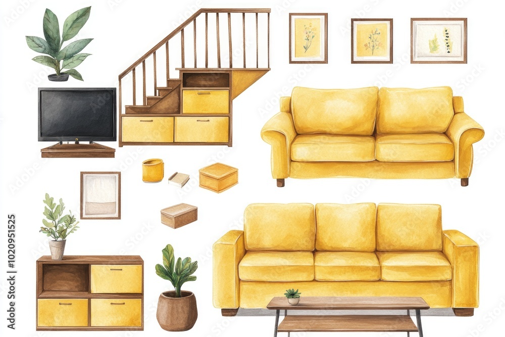 Fotografía Cozy living room with bright yellow furniture and a television, perfect for a re