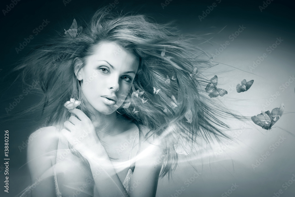 Cuadro en lienzo Portrait beautiful young woman with butterfly