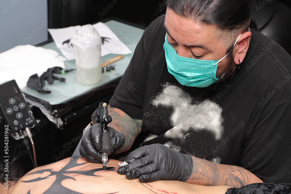 Cuadro en lienzo Tatuador en sesión de tatuaje tatuando un tatuaje a una persona