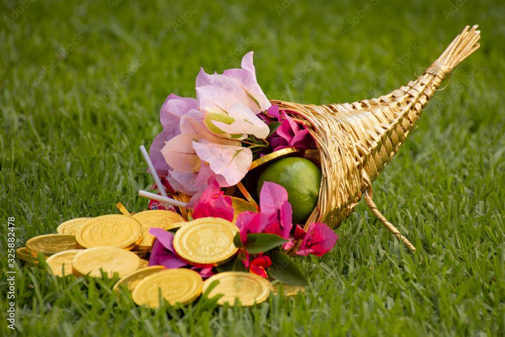 Fotografía Cuerno de la abundancia con flores, monedas de oro, dulces y fruta sobre un camp