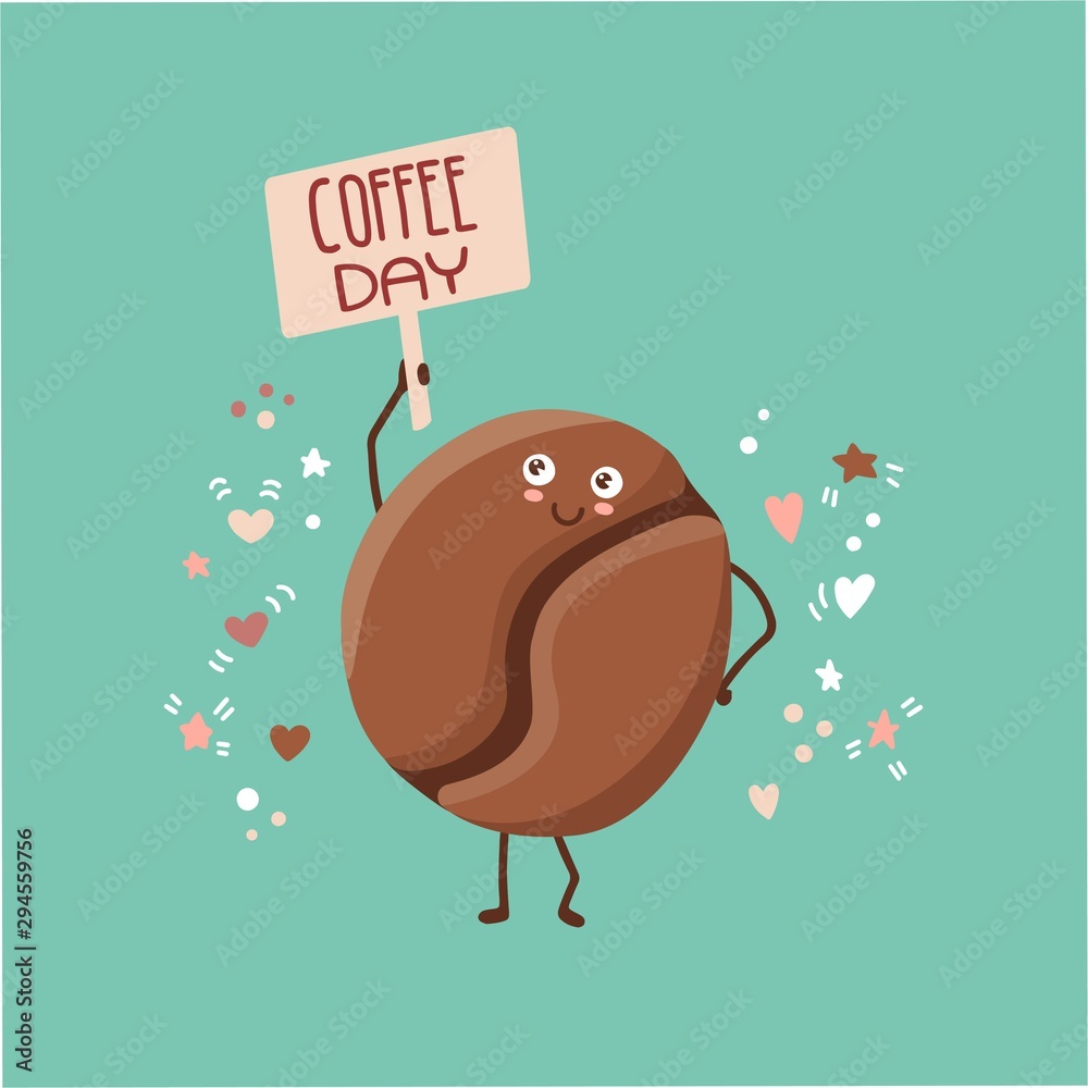 Fotografía Cute vector illustration of a funny coffee bean with a plate and congratulation on the World Coffee Day