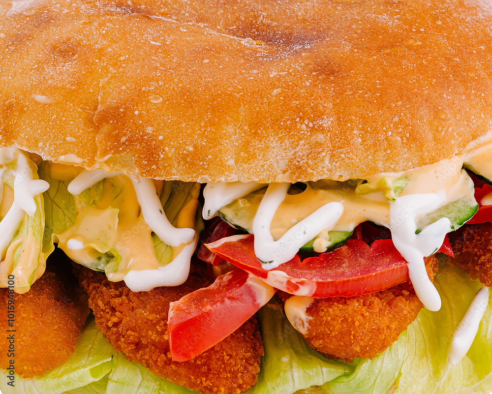 Fotografía Delicious crispy chicken burger with fresh vegetables and sauce is lying on a wh