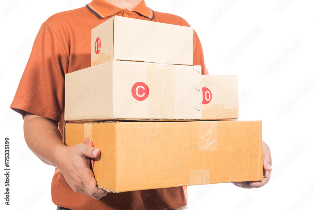 Fotografía delivery man in brown uniform holding a package box isolated on white background