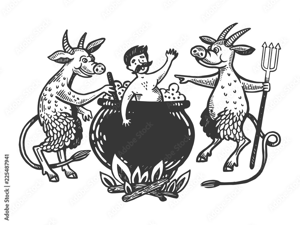 Fotografía Devils boil man in cauldron engraving vector illustration