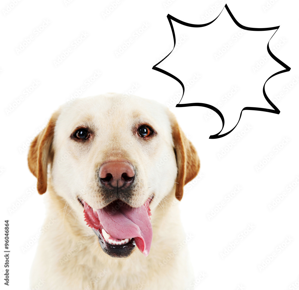 Fotografía Dog with empty cloud bubble above her head, isolated on white