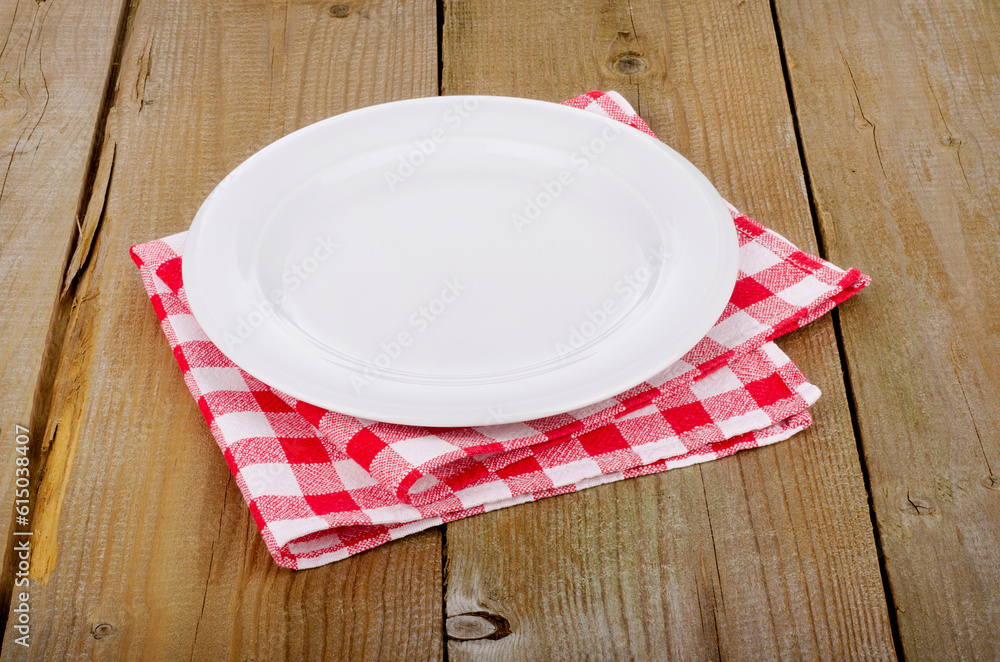 Fotografía Empty plate on red-white checkered tablecloth in an old wooden table