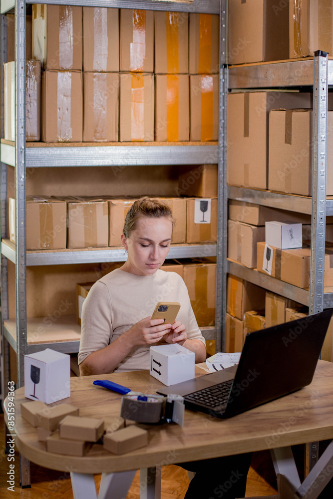 Fotografía Female small business owner using mobile app on smartphone checking parcel box