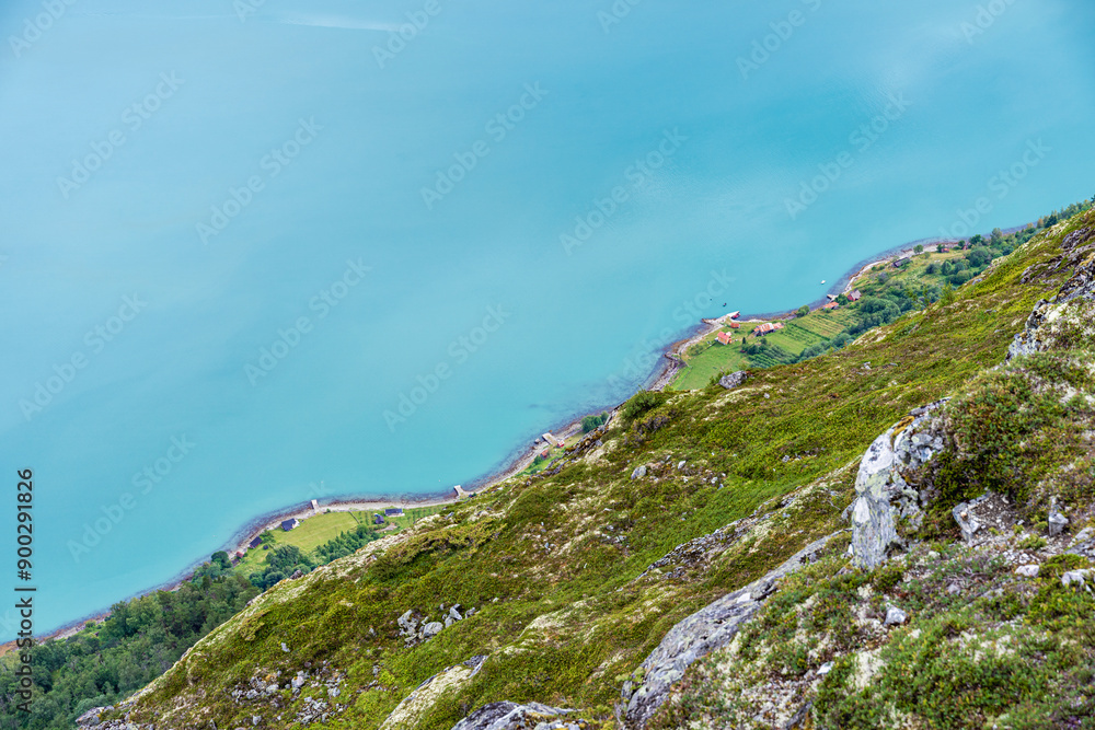 Fotografía Farms by the coastline of the Lustrafjorden Fjord, Norway.