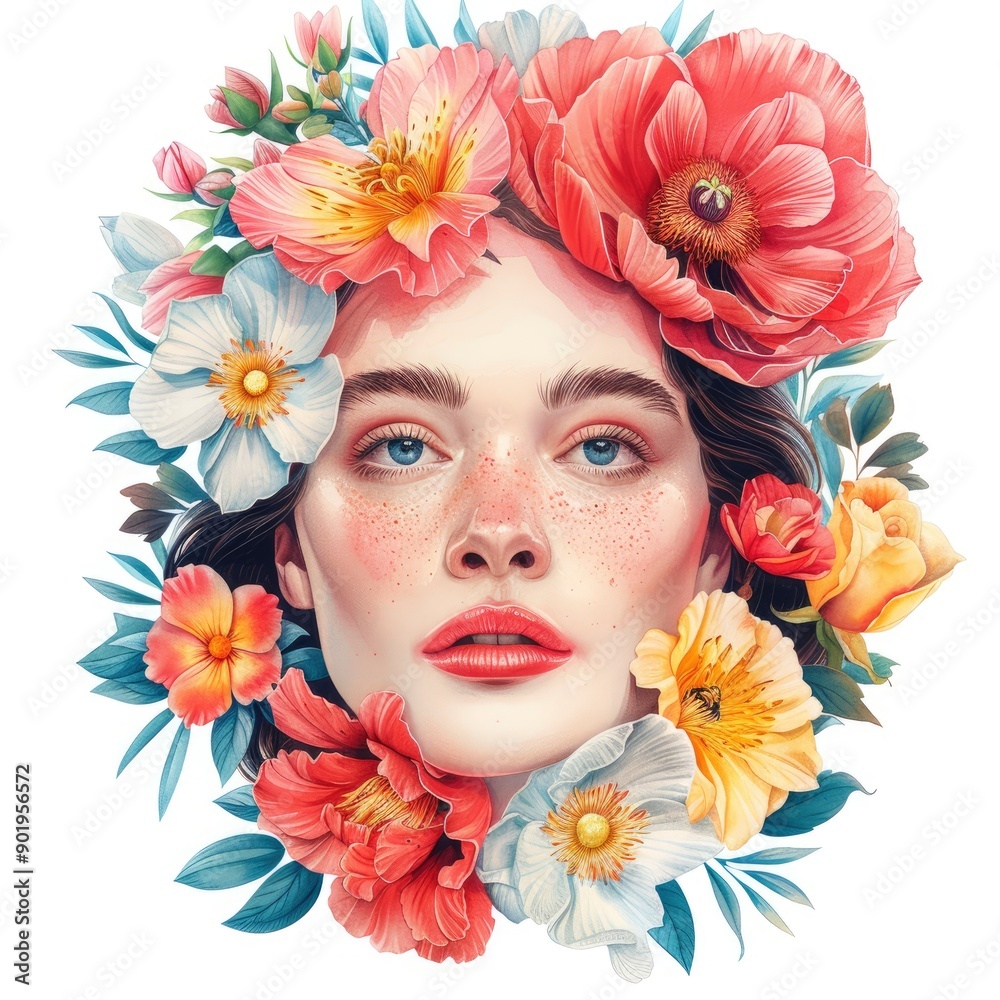 Fotografía Beautiful Womanýs Face Adorned With Flowers, Hand-Drawn Watercolor Illustration