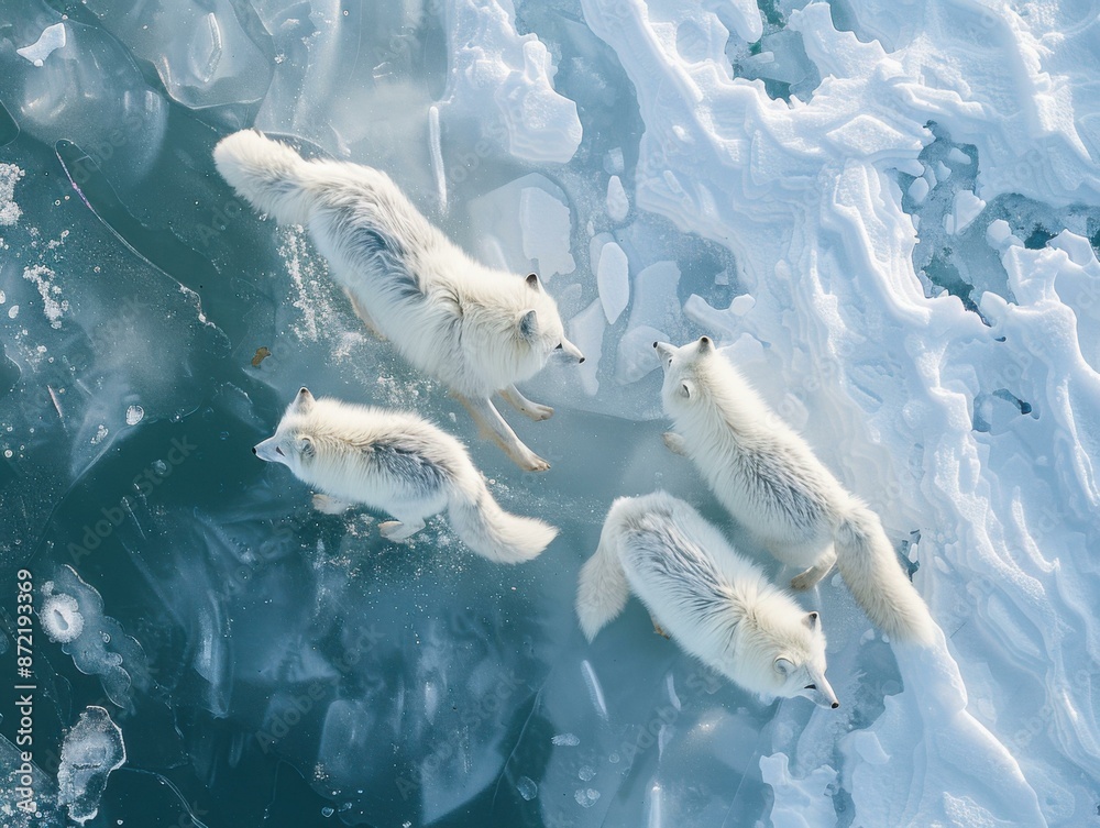 Fotografía Four white arctic foxes running on ice. AI.