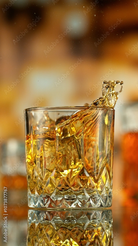 Fotografía Freeze Motion of Pouring Whiskey into Glass with Ice.