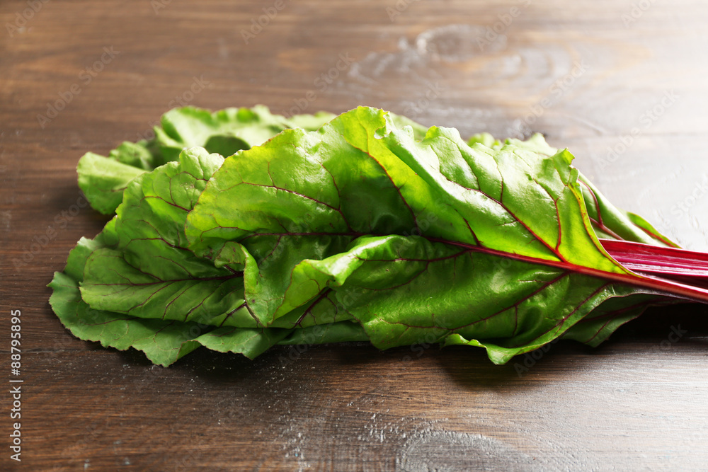 Fotografía Fresh swiss chard on wooden table, close up