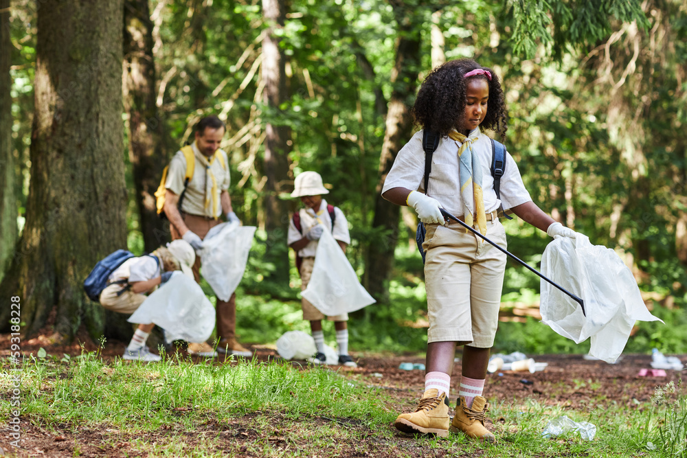 Fotografía Full length portrait of cute black girl as girl scout helping clean forest and h