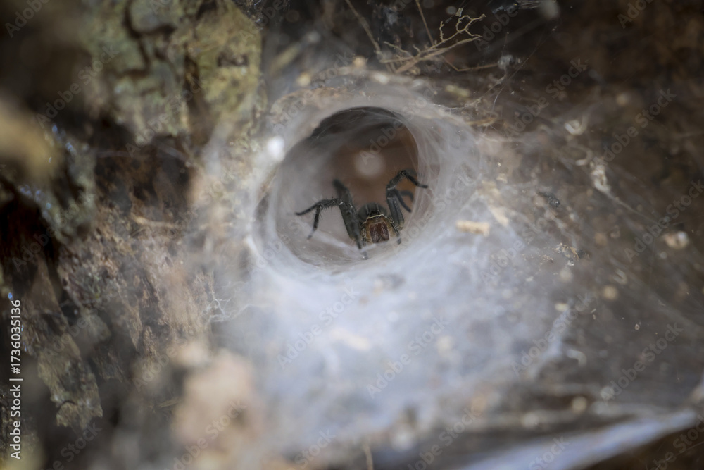 Fotografía Funnel web spider patiently waiting inside its silky nest in nature