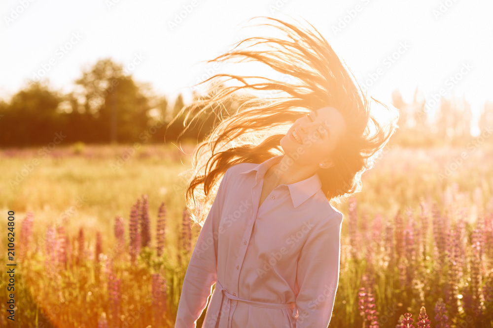Fotografía Gorgeous Romantic Girl in sunset wildflower field